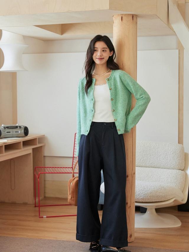 充满着人命力的绿色毛衣外衣,内搭蕾丝边吊带,淡雅又斯文,阔腿裤聘请高腰款,更显腿长。