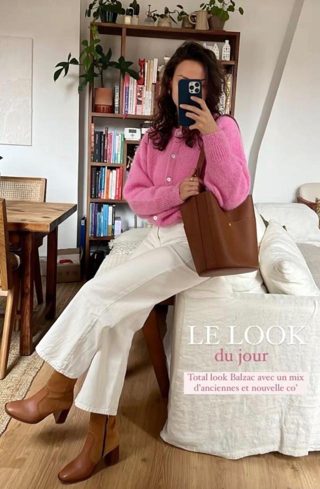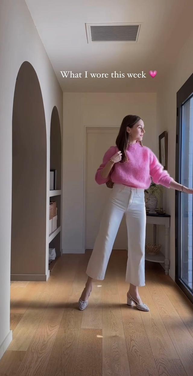 春天穿粉毛衣,要用白裤子中庸甜腻感,侧目扮嫩的情况,再配上棕色低跟短靴,背款棕色托特包,更协调。