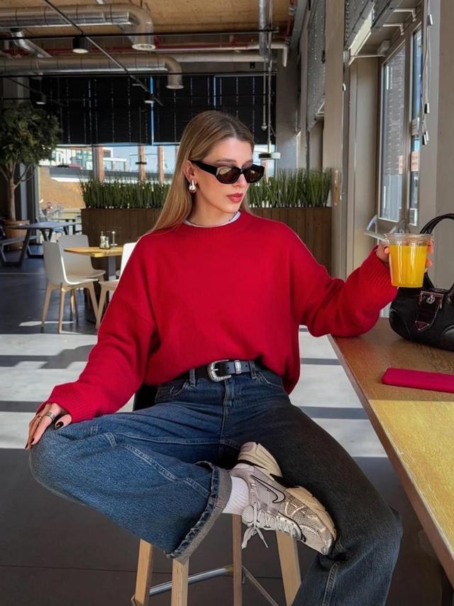 红色套头款毛衣,天然方式基础,可是在神气惊艳,显白又洋气,搭配牛仔直筒裤,又能均衡红色的张扬。