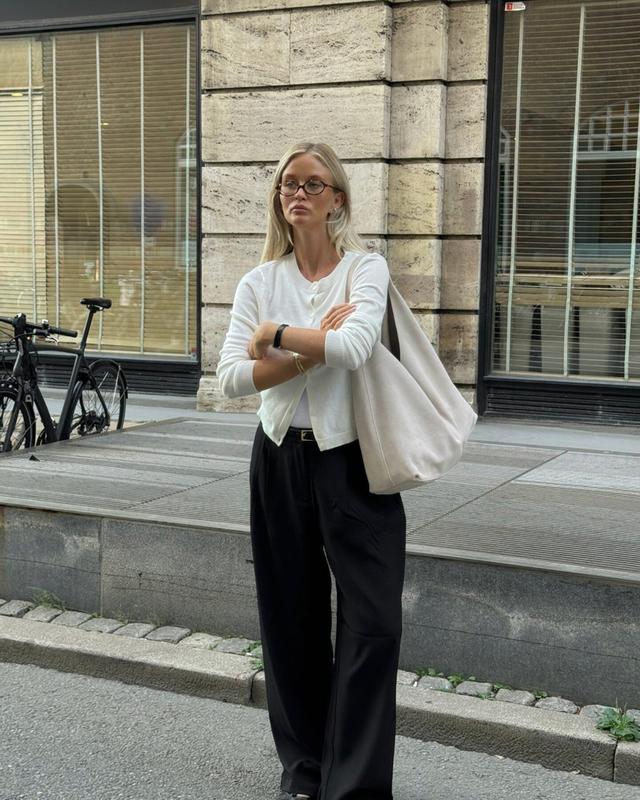 长度刚好到腰线位置,配条高腰西装阔腿裤,“上短下长”优化身段比例。