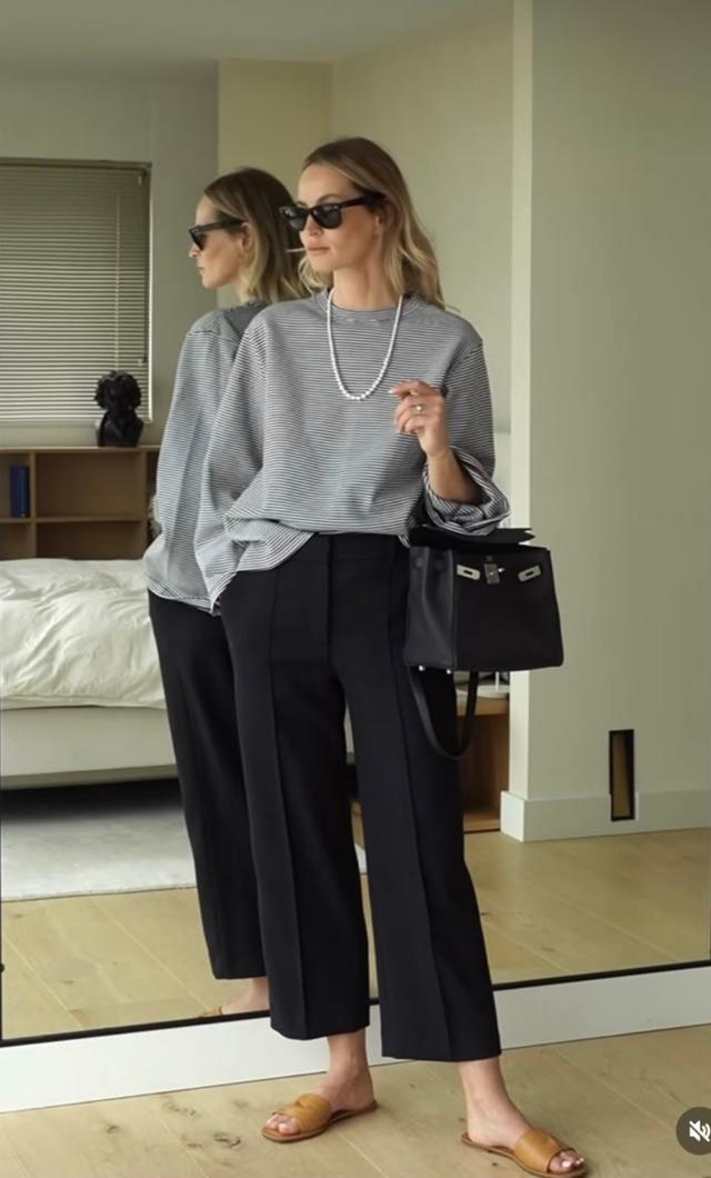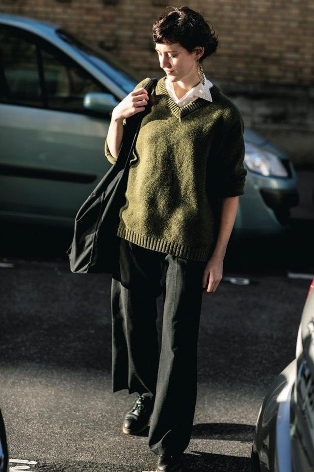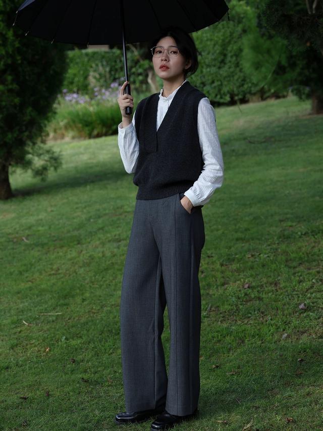 一件灰色的条纹毛衣,只需要搭配上中缝策画的西装裤,裤腿败露脚踝,法度会愈加狭窄,让你缩小好意思出圈。