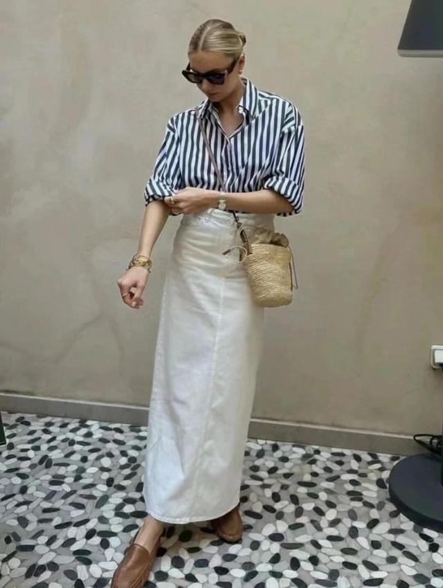 经典的条纹衬衫,还得配白色直筒裙。
