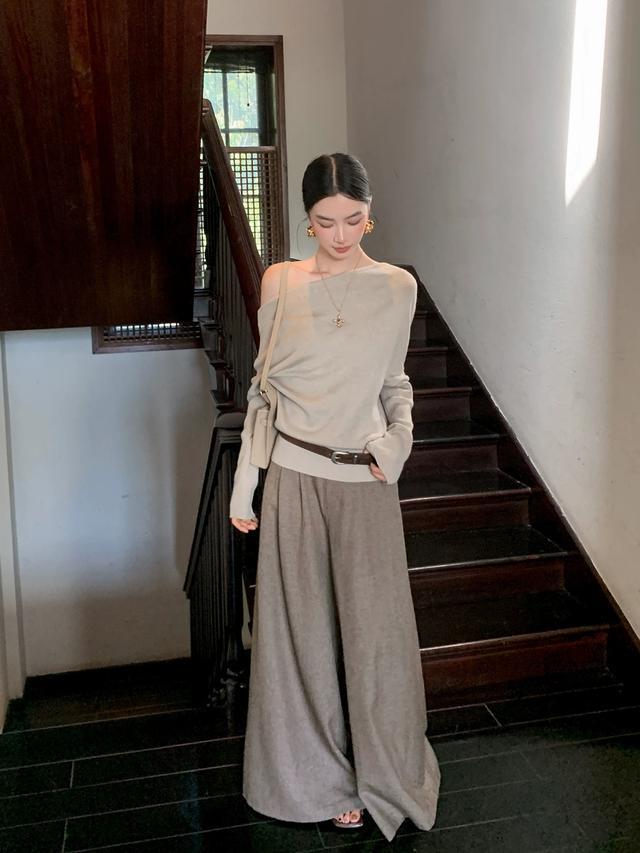 败露一半肩膀穿,佩带长项链,不错优化头肩比,搭配垂感统共的阔腿裤,好慵懒~