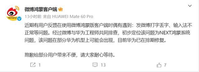 三言科技 10月13日音讯,10月12日,微博鸿蒙客户端发文称,近期有效户响应在使用微博鸿蒙版客户端时偶有遭遇发微博打字丢字、输入法不宽泛等问题。经由微博与华为工程师共同排查,初步定位该问题为NEXT鸿蒙系统问题,该问题在部分华为机型上可能会出现,现在华为已在排期成就。