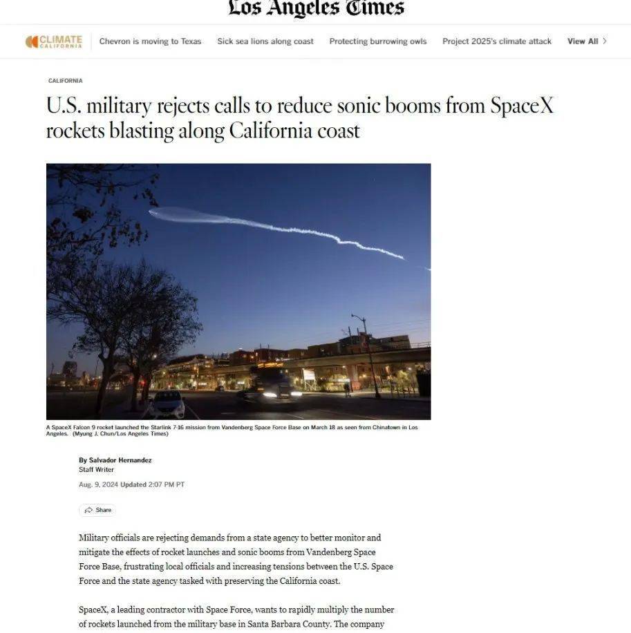 6月,天际部队官员初次承认,包含SpaceX活动在内的火箭基地辐照的音爆,如期打扰了圣巴巴拉县(Santa Barbara)、文图拉县(Ventura)和洛杉矶县大致100英里海岸线近邻的住户和野纯真物。 然则,天际部队官员示意,每年的火箭辐照次数仍将连续大幅加多。 对此,州委员会天然批准了辐照次数的加多,但要求天际部队必须加强对基地表里野纯真物的监测,并耀眼分析音爆对“南边海獭、加州红腿蛙、西雪鸻和加州最小燕鸥”等野纯真物的影响。 委员会刻薄的七项条目包括: 制定书面运筹帷幄,尽量减少音爆的影响和畛域; 制定夜间辐照的灯光管理运筹帷幄,限制面向海滩区域的灯光畛域 选定措施向海滩旅客和渔业提供更多联系辐照过火影响的信息等 …… 不停加多的火箭辐照频率,主要起原于坐落在霍桑(Hawthorne)的SpaceX。 对此,马斯克示意,办公室将不绝迁往德克萨斯州(Texas)。这也激发了德克萨斯州的防卫。 委员博奇科的气派无意不错代表住户。在关闭麦克风的音频之前,她说:“有什么比芜乱环境然后再试图斥地它更不菲的呢?”