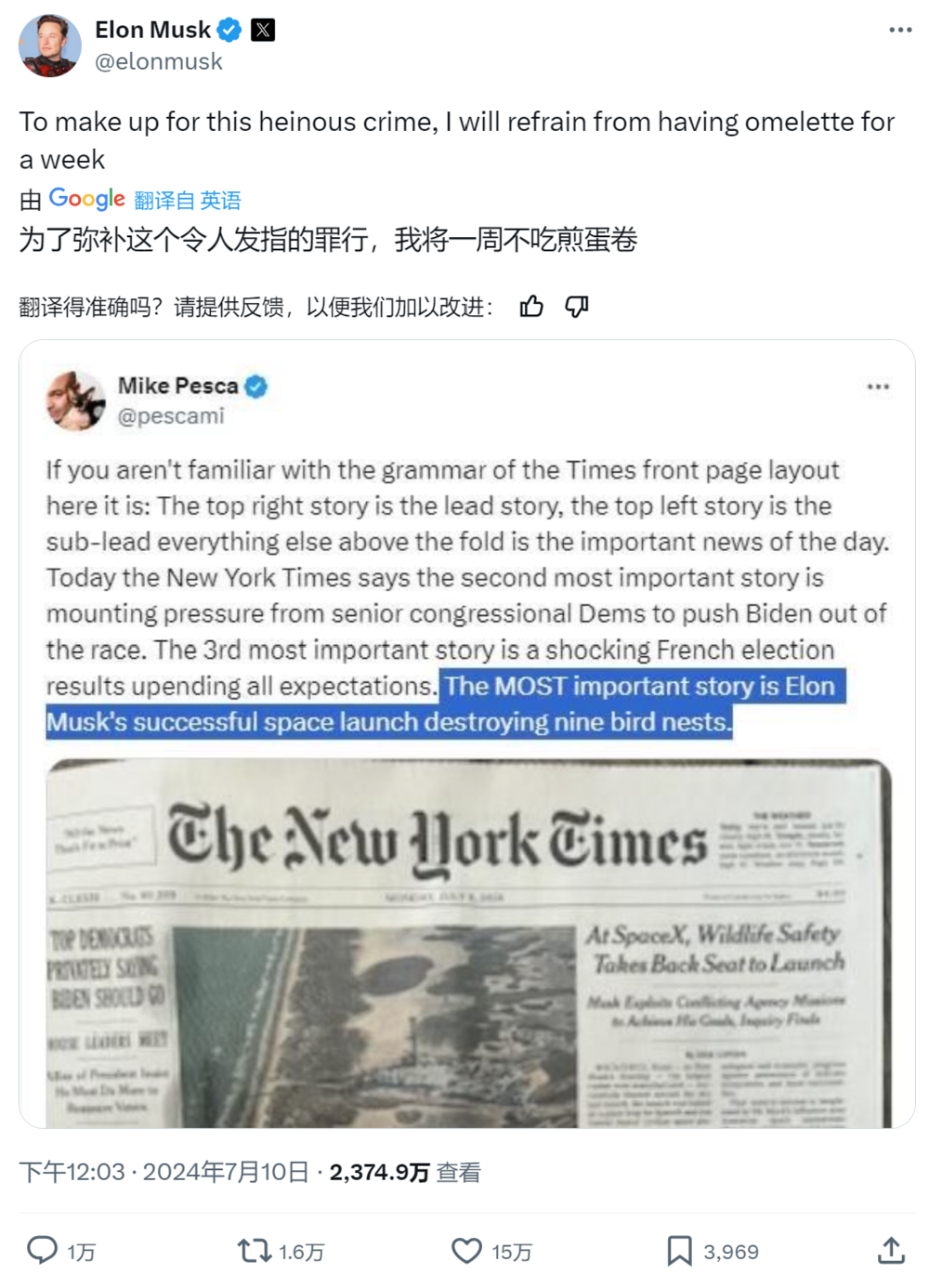 起原:SpaceX 辐照公告中,SpaceX也提到音爆问题。 “返航的超重型火箭将从超音速降速,这会导致着陆区周围区域出现音爆。但一般来说,周围区域的住户普遍只会听到狭小、雷鸣般的噪声,决定不雅察者感受进程的因素是:天气和距离返航场所等。” 疑窦4:鸟类保护 据悉,星舰辐照近邻有受保护的鸟类栖息。尽管不在鸟类养殖季节,为了秘密生物芜乱,SpaceX仍然践诺了严格的监控措施,在每次辐照前后使用红外无东说念主机进行监控。 非渔利组织“海岸湾与河口运筹帷幄”(Coastal Bend Bays&Estuaries Program)还曾撰写长文,揭露SpaceX在6月6日“箭飞蛋打”的恶行:因星舰告捷辐照而被毁坏的九个鸟巢,“鸟蛋碎了一地”。 对此,马斯克还曾有益陈说:为了弥补这一滔天罪状,我将一周不吃煎蛋饼。”