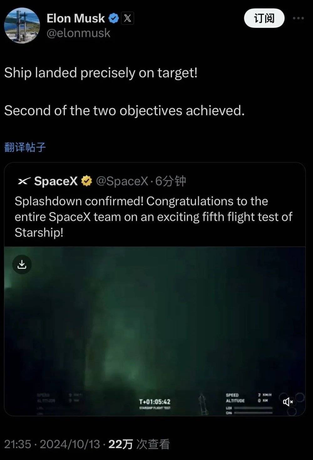 任务告捷秀丽着在火箭可肖似使用时候方面,SpaceX再次取得要紧冲破,为翌日的载东说念主火星任务奠定坚实基础。对此,SpaceX CEO埃隆·马斯克连发了多条推文庆祝,马斯克示意:“莫得虚拟身分的科幻演义”。 星舰第五次辐照有哪些看点?层层蔓延之下,SpaceX到底那处被“诟病”?发展于今天,SpaceX达成了哪些合营? 一、SpaceX五飞:初次尝试“筷子夹火箭” 总结第四次星舰辐照后果,SpaceX的确完成了运筹帷幄当中的整个主义:达成超重型火箭软着陆,星舰飞船再入、着陆点燃、海上溅落。 这次,星舰试飞的主要主义是:尝试初次原位复返辐照场并捕捉超重型火箭,以及再一次星舰飞船的再入和着陆点燃,杀青星舰准确溅落在印度洋。