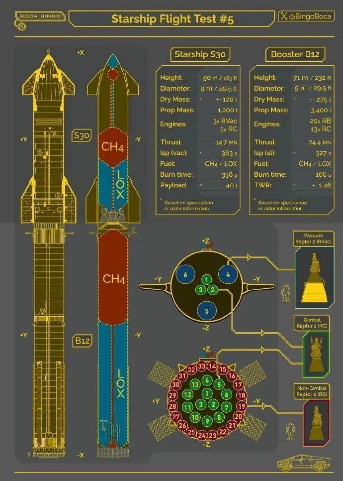 除了捕捉臂的看点,星舰还全面升级了隔热罩,以便捷软着陆责任。 据悉:时候东说念主员花了12000多个小时,以更新通盘热提神系统,包括选拔新一代隔热片、备用烧蚀层等。 通常,本次辐照使用的超重助推器B12和星舰S30都进行了升级校正: B12: 增设都集船舷上部位置的FTS。 增设特等的激动剂箱9个,分为3组,以将特等的氧气添加到助推器集管箱,匡助着陆顺利进行。 增强助推器两侧纵梁,提高褂讪性。 S30 升级TPS隔热罩,大部分瓷砖下增设一层烧蚀层。 优化鼻锥上的六角形天线,养息为有用载荷门下方的单个大六角形天线。 优化六角形TPS下方的天线与超重型助推器上的天线保持一致。 吊销右襟翼录像头,同期,在每个襟翼旁增设4个录像头盒。 增设两个新透风口,分离用于氧气和甲烷。 本次辐照运筹帷幄的齐全时序表: 时/分/秒事件 01:15:00 SpaceX遨游主宰作出辐照决议,原意激动剂运行加注 00:49:50 星舰燃料(液态甲烷)进行加注 00:48:40 星舰LOX(液氧)进行加注 00:40:40 助推器燃料进行加注 00:34:03 助推器液氧进行加注 00:19:40 助推器和星舰的猛禽引擎运行冷却 00:03:20 星舰激动剂加注完成 00:02:50 助推器激动剂加注完成 00:00:30 SpaceX遨游主宰给出辐照领导 00:00:10 水冷钢板启动 00:00:03 猛禽点燃门径运行 00:00:00 都备够刺激 00:00:02 腾飞 00:01:02 MAX-Q(火箭机械应力峰值) 00:02:33 超重助推器MECO(大多数引擎关闭) 00:02:41 热分离(星舰点燃,两级分离) 00:02:48 超重助推器复返点燃运行 00:03:41 超重型助推复返点燃关闭 00:03:43 抛热分离环 00:06:08 超重助推器跨音速 00:06:33 超重型着陆点燃运行 00:06:50 若是不进行回收尝试,则超重助推器溅落 00:06:56 超重助推器着陆点燃关闭,尝试回收 00:08:27 星舰引擎关闭 00:48:03 星舰再入 01:02:34 星舰跨音速 01:03:43 星舰亚音速 01:05:15 着陆翻转 01:05:20 着陆点燃 01:05:34 令东说念主欢乐的着陆! 二、层层艰巨SpaceX的辐照,“环境分析”都包括了什么? 星舰第五次试飞之前,一拖再拖的辐照时刻,恭候的是好意思国联邦航空管理局(FAA)的批文。 10月12日,SpaceX在X上更新了辐照运筹帷幄,瞻望监管部门将批准星舰在10月13日试飞。