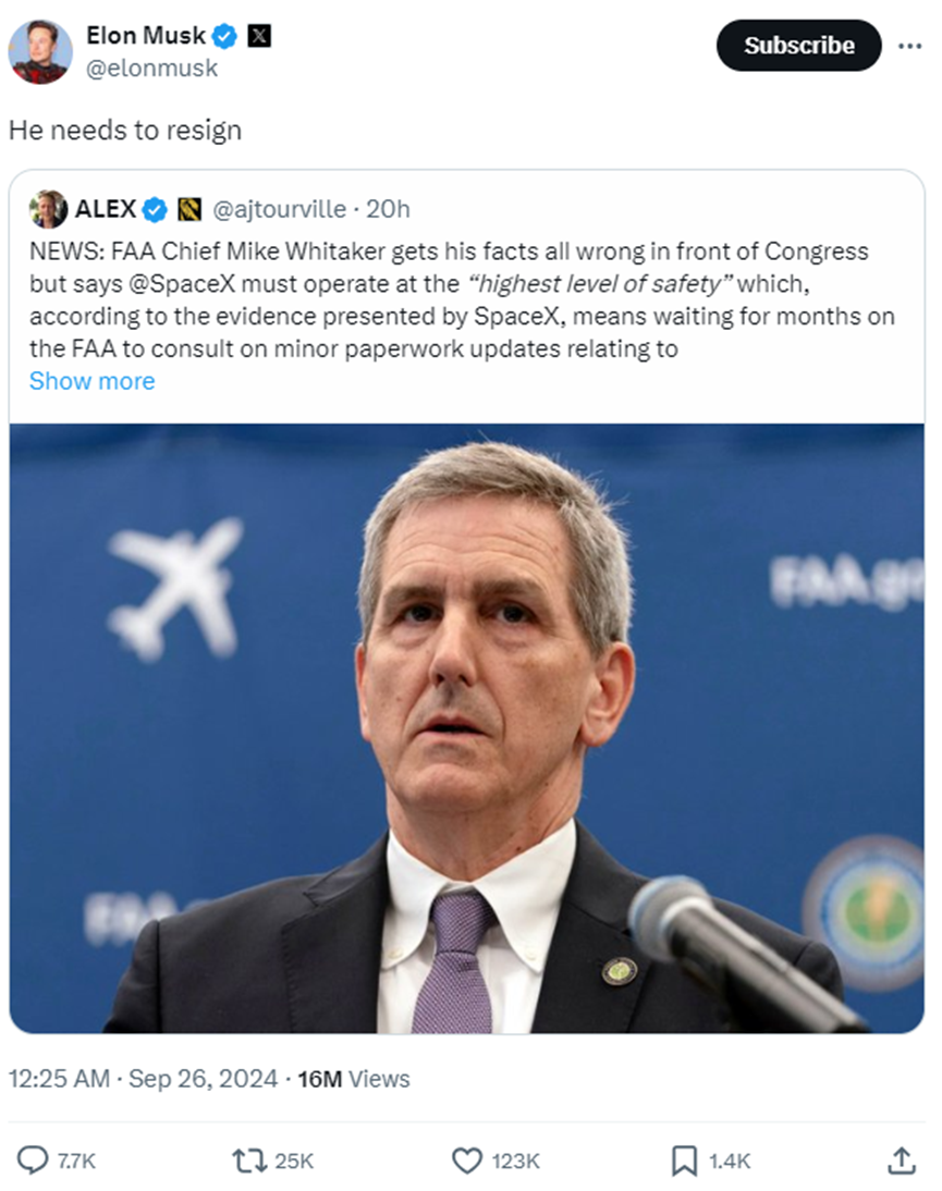 值得耀眼的是,这次,监管机构“高兴”给了两次辐照的批文,意味着星舰第6次遨游极有可能在第5次遨游之后很快进行。 “鸽”到震怒的SpaceX,究竟被拦在联邦航空管理局(FAA)的哪一关? 这次辐照的多番蔓延,并非基于安全问题或手续阐扬,而是针对环境分析的角度迟迟未能获批。因此,SpaceX也同FAA产生了厉害的矛盾,马斯克致使曾在X上公开叫嚣FAA局长迈克·惠特克“应该离职”。